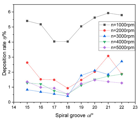 When both the groove diameter ratio and the groove width ratio are 0.5, in order to make the study universal, we choose an 8 μm groove depth to conduct computation. Figure 10 presents solid particles’ distribution with different spiral angles and 1000 rpm. Figure 11 shows deposition rate variation rules with the different spiral angle and different rotational speed.