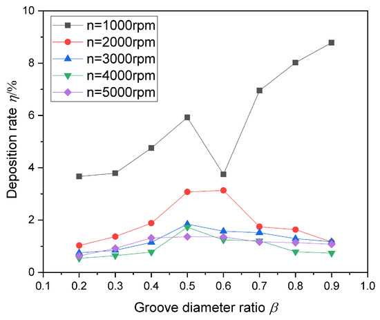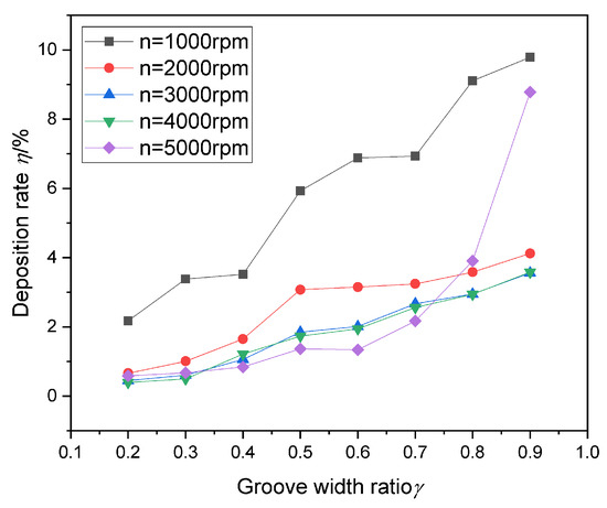 As seen in Figure 16, the deposition rate increases with the increase of the groove width ratio, and the higher the rotational speed is, the lower the deposition rate increases. At 1000 rpm, the deposition rate of groove width ratio, 0.9, is about 400% higher than that of groove diameter ratio, 0.2. However, when the rotational speed reaches 5000 rpm and the groove width is relatively high, the deposition rate increases sharply. This indicates that the increase of the groove width ratio and the increase of groove is the space of the main deposition area, which is the main factor for the increase of deposition rate. The higher the rotational speed, the stronger the hydrodynamic effect and pumping effect, and the greater the probability of particle escaping from the outer diameter side, leading to the increase of the rotational speed and the slowdown of the deposition rate. When the rotational speed reaches 5000 rpm, the flow in the groove becomes more complicated, the re-flux becomes more obvious, and the deposition in the low-pressure zone is intensified. The high pressure in the outer groove root is significantly affected by the low-pressure zone in the adjacent spiral groove, and the deposition near the outer groove root may also be aggravated, resulting in a sudden increase in the deposition rate of high rotation speed and high groove width ratio.