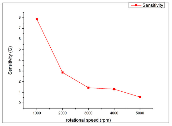 In order to measure the sensitivity of the deposition rate to the change of the groove diameter ratio, the ration of the sensitivity of the deposition rate to the groove diameter is defined as the ratio of the change of deposition rate to the change of corresponding groove diameter ratio. This is denoted by G. The variation curve of ratio of the sensitivity of the deposition rate to the groove diameter, along with the rotating speed, is shown in Figure 14. With the increase of the rotating speed, the ratio of the sensitivity of the deposition rate to the groove diameter decreases continuously. When the rotating speed increases from 1000 to 2000 rpm, the sensitivity decreases sharply, while when the rotating speed increases from 2000 to 5000 rpm, the sensitivity decreases slowly. It shows that the lower the speed is, the more sensitive the deposition rate is to the groove diameter ratio. The sensitivity at 1000 rpm is 14 times that at 5000 rpm. The higher the speed, the less sensitive the deposition rate is to the groove diameter ratio. This shows that the increase of rotational speed, the increase of particles in centrifugal force, the hydrodynamic effect of the spiral groove, and the pumping effect are obviously enhanced, and the lubrication film, particle movement, and film pressure played a leading role in aspects such as making particles that entered the groove escape from the inner diameter side, thus effectively reducing the deposition rate. In contrast, the medium groove diameter ratio does not have the obvious advantages of the above aspects, resulting in a relatively high deposition rate.