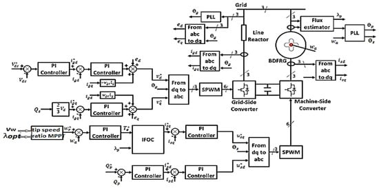 The BDFRG dynamic model is based on the theory of space vector, shown in Equations (1)–(3) [4]. The process of decoupling both the torque-producing and flux-producing current components is only possible in a special kind of frame transformation. This is mainly because of the bizarre structure of the BDFRG and the fact that the primary and secondary windings electrical quantities (current, flux, etc.) both have variant pole numbers and also different frequencies. The primary winding quantities are transformed into a general reference frame that rotates at a speed of while the secondary winding quantities are transformed into another frame that rotates at speed of ( − ) [25]. The general frame speed is preferred to be the same as the primary winding supply frequency. The resulting dynamic model based on the dual frame transformation is described by Equation (1). The flux equation is presented in Equation (2). Finally, the electromagnetic torque and mechanical speed expressions can be stated as in Equation (3) [26,27].