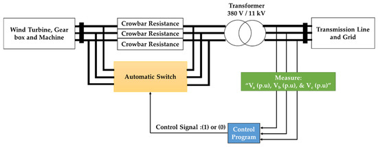 The crowbar is one of the used solutions in the cases of severe disturbances such as heavy faults. In general, the crowbar provides a safe path for the heavy fault currents by short-circuiting the original path, subsequently damping the destroying fault currents and protecting the generator from the increased (overrated) currents. Basically, crowbar consists of a three-phase resistance called crowbar resistance. These resistances could be connected and disconnected by means of power electronics switches. Severe disturbances lead to raising the currents in the generator above the allowable values, and also disturb the DC link voltage. In general, the activation (connection) process of the crowbar protection system is carried out only in the case of severe disturbances (heavy faults). After clearing the disturbance (fault), if the current and the DC link voltage are returned back to its allowable values, the crowbar will be deactivated (disconnected). Moreover, the generator returned back to its normal configuration. If the current and the DC link voltage are not returned to its allowable values, the activation of the crowbar protection system can be restarted. Moreover, the crowbar has been studied in a lot of fields by researchers as mentioned in the paper [28,29,30].
