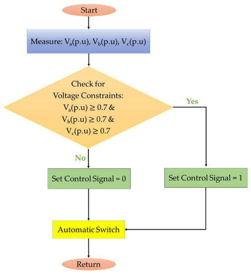 This work aimed to propose a simple crowbar control strategy. As shown in Figure 2, the used crowbar technique is the outer crowbar. The main components of the proposed crowbar control system are voltage measuring units for all phases, a control program and an automatic switch. The main aim of the crowbar control program is producing the control signal which would control the automatic switch. The main idea of the proposed strategy is based on continuously monitoring and measuring the per unit rms terminal voltage for each phase individually. According to the flowchart shown in Figure 3, if the measured rms voltage value, of each phase, is within the predefined voltage constraint limits (more than or equals to 0.7 p.u.), the control scheme would behave in this case as a normal steady-state operating condition, then the control program would set the output control signal to (1). Otherwise, if any one of the measured rms voltage values is lower than the minimum predefined voltage constrain limit “0.7 p.u.”, the control scheme would behave with this case as a faulty condition, then the control program would set the output control signal to (0). In the case “Output control signal = 1”; the automatic switch would be switched on and bypassing the crowbar “the crowbar is deactivated”, while in the case “Output control signal = 0”, the automatic switch would be switched off, activating the crowbar. So, the operation technique of the proposed method is very simple in comparison with the methods that were used in both Ref. [20] and Ref. [29] to achieve the same goal, whereas Ref. [20] used a complex fuzzy control system and improved its performance by adding a PI to the used fuzzy control system. Ref. [29] used a complex ANFIS system.