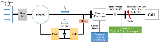 The studied system is shown in Figure 4, where the BDFRG (supported by the proposed crowbar) is tied to the network by a transmission line after the coupling transformer. The main data of the simulated BDFRG and wind turbine are described in Table A1 and Table A2 (Appendix A) [4].