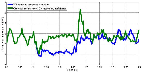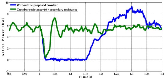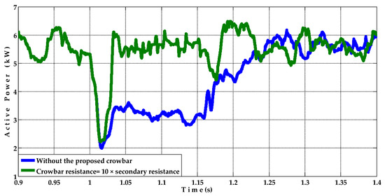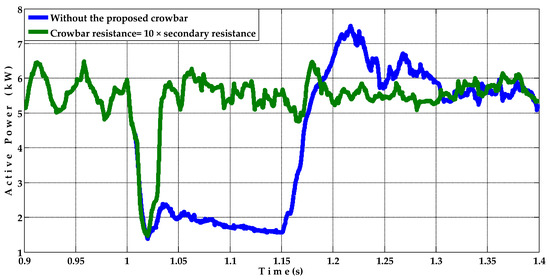 The active power of the BDFRG (with and without using the proposed crowbar) is shown in Figure 6. As obvious in the case of “without using the proposed crowbar”, during the fault, the active power totally dropped to zero kW for 150 ms (fault duration time). In the case of using the proposed crowbar, during the fault, the active power was effectively improved and quickly returned to its pre-fault value.