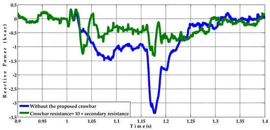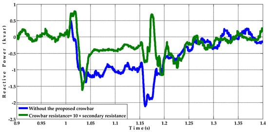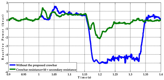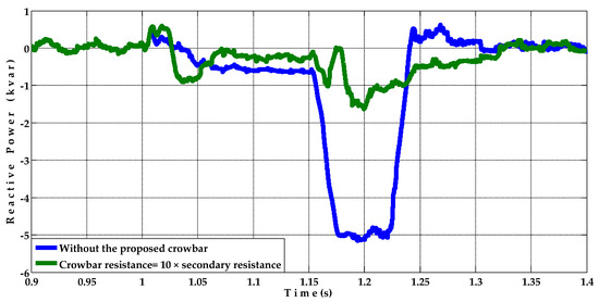 The reactive power of the BDFRG (with and without using the proposed crowbar) is shown in Figure 15. As shown, the reactive power was adjusted at zero value (unity power factor) before the fault occurrence. Following the clearance of the fault, in the case of “without using the proposed crowbar”, the absorbed reactive power, by the BDFRG from the grid, reached about 2.115 kvar. In the case of using the proposed crowbar, after fault clearance, the absorbed reactive power was reduced to 1.158 kvar only and quickly improved until reaching its pre-fault value.