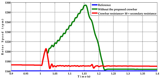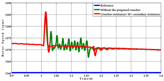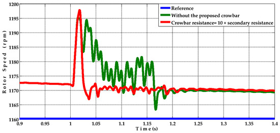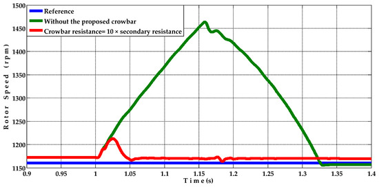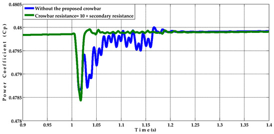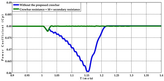 The rotor speed of the BDFRG (with and without using the proposed crowbar) is shown in Figure 8, which has a reference value equal to 1160 rpm. During the fault, in the case of “without using the proposed crowbar”, the rotor rapidly accelerated, then after fault clearance, the rotor speed reached about 1464 rpm, which led to a decrease in the power coefficient of the WT from 0.48 to less than 0.3846 as shown in Figure 9. In the case of using the proposed crowbar, the rotor speed increased instantaneously to about 1213 rpm only, then quickly improved.