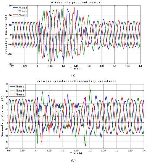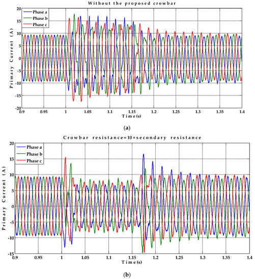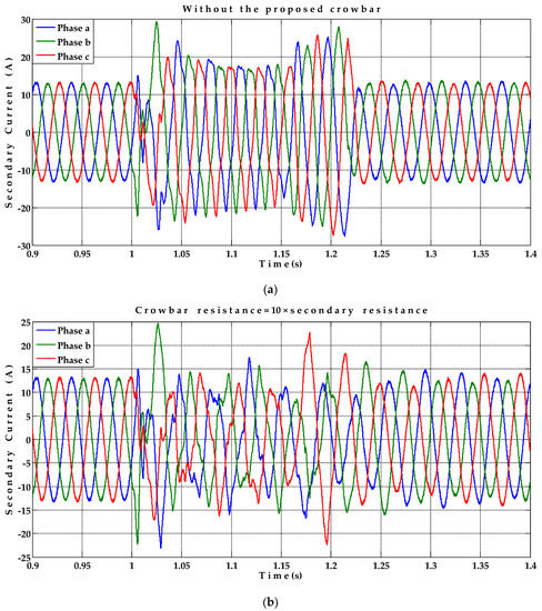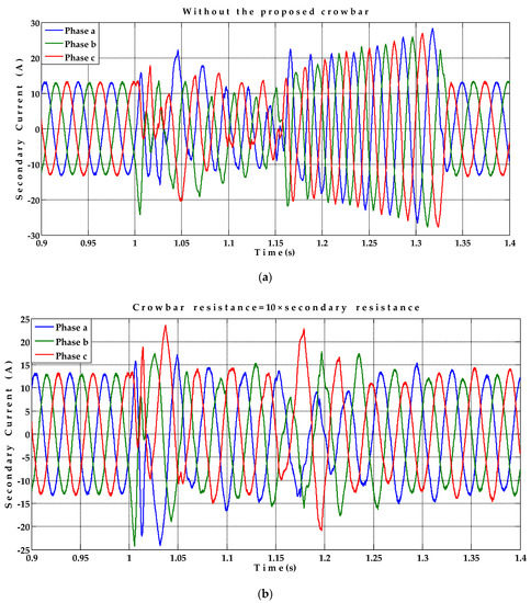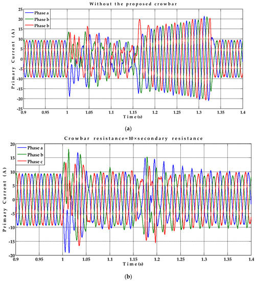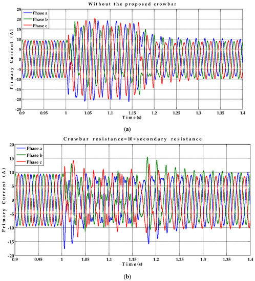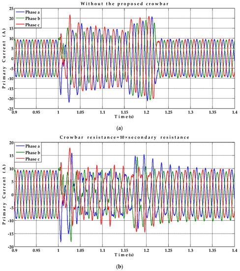 The primary and secondary currents of the BDFRG (without and with using the proposed crowbar) are shown in Figure 18 and Figure 19 in the same order. In the case of “without using the proposed crowbar”, during the fault, both currents were increased, the primary current was increased to about 190% (17.68 A) of the pre-fault value (9.32 A) and the secondary current was increased to about 181% (23.58 A) of the pre-fault value (13.05 A), while in the case of using the proposed crowbar, as shown in Figure 18b and Figure 19b, during the fault, both the primary and secondary currents were effectively improved.
