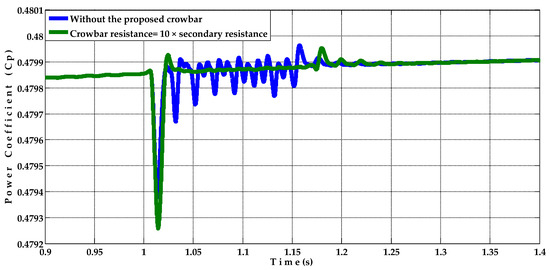 The rotor speed of the BDFRG (with and without using the proposed crowbar) is shown in Figure 16, which has a reference value equals to 1160 rpm. During fault, in the case of “without using the proposed crowbar”, the rotor rapidly accelerated and the rotor speed reached about 1184 rpm, which led to a decrease in the power coefficient of the WT from 0.48 to less than 0.4794 as shown in Figure 17. In the case of using the proposed crowbar, the rotor speed increased instantaneously to about 1186 rpm, but with damped oscillations than in the other case, then quickly improved.