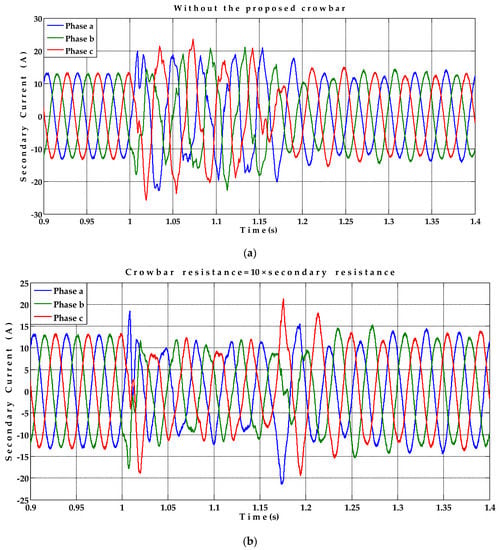 Secondary current of BDFRG without and with the proposed crowbar under line-to-line fault occurrence: (a) Without the proposed crowbar; (b) With the proposed crowbar.
