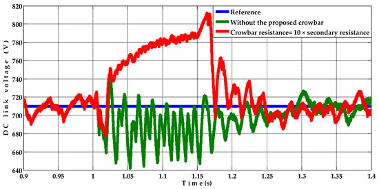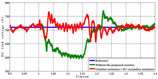 The dc link voltage of the BDFRG (with and without using the proposed crowbar) is shown in Figure 20, which has a reference value equal to 710 V. Under the fault occurrence, in the case of “without using the proposed crowbar”, the dc link voltage was decreased to about 642 V. In the case of using the proposed crowbar, the dc link voltage increased to about 800 V, but with damped oscillations than in the other case, then the dc link voltage improved and returned to its pre-fault value.