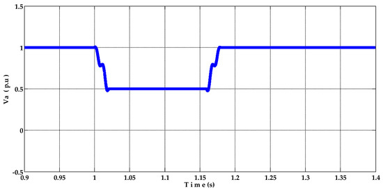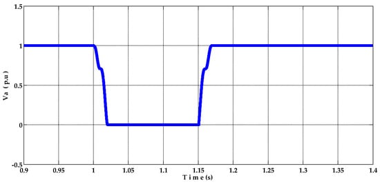 The per unit rms terminal voltage (Va) of the BDFRG, as shown in Figure 29, at the instant of fault occurrence, the terminal voltage dropped to zero p.u. for 150 ms due to the occurrence of the studied double line to ground fault; then, after fault clearance, the terminal voltage returns to its original value (1 p.u.).