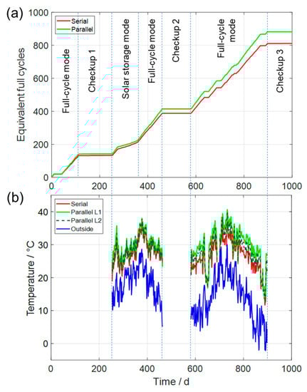 - The difference in aging between the serial and parallel battery architectures is only small and likely due to the higher and presumably more inhomogeneously distributed cell temperatures in the system with parallel architecture. Higher temperatures may result from higher ohmic losses in the current-collection rails due to significantly higher currents as compared to the serial architecture.