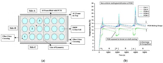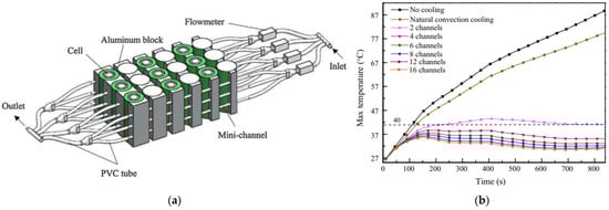 | Rao et al. (2016) [152] | Composite (PCM/mini-channel coupled) | A PCM and mini-channel coupled system was proposed. For eight mini-channels and an 8 × 10−4 kg s−1 flow rate, the optimal operating temperature and thermal conductivity for the PCM were 308.15 K and 0.6 W m−1 K−1, respectively. In addition, for the same operating conditions, when the maximum temperature of the PCM-based BTMS was 335.4 K, the maximum temperature for the proposed system was 320.6 K. | Numerical simulation |