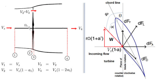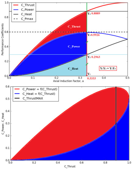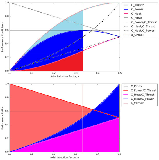 Betz limit [56,57] describes an upper limit for the achievable as 0.5926 at an axial induction factor of 0.333, and beyond this value, the curve monotonically decreases. Realistic is, however, smaller than due to the losses created by the blade profile, spanwise twist, rotation and the relative flow. Blade Momentum Theory (BMT) gives a simplified version of the performance coefficients as a function of the axial induction factor, a.