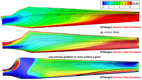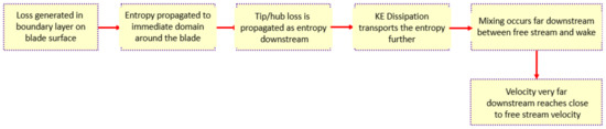 The results of py_BEM are converted into a 3D blade shape for further analysis in high-fidelity framework using a blade generator [48]. As an additional study to improve airfoil characteristics, curvature-controlled 2D airfoil generation is demonstrated, which has a minimized drag coefficient compared to S809 airfoil. A complete account of loss propagation in the computational domain is described. Loss generation in the boundary layer as entropy through boundary vorticity flux analysis and propagation to immediate domains around the blade leading to tip and hub loss, which travels further downstream and becomes mixed out with free stream, is depicted in Figure 2.