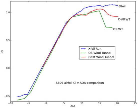 Cl vs. AoA plot showing the difference between XFOIL run and wind tunnel data at Delft and Ohio State University for S809 airfoil at Re = 1.0 × 106.
