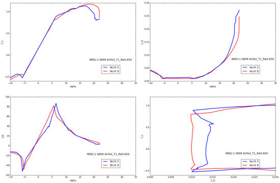 The lift and drag polar for our purposes are obtained from XFLR5/XFOIL runs for a range of Reynolds numbers and AoAs for several airfoils. XFOIL incorporates turbulence level variation while calculating airfoil polar using a non-dimensional value called NCRIT. NCRIT values used in XFOIL are usually taken as nine for clean inflow, and Figure 4 shows the difference in lift and drag polar of S809 airfoil at a Reynolds number of 0.65 × 106 for two different NCRIT values of 5 (turbulent flow) and 9 (clean inflow).