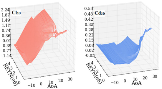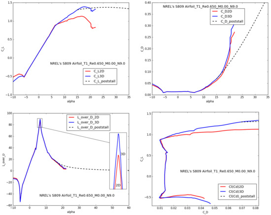 Rotation of unducted rotors delays stall due to Coriolis force and centrifugal pumping of flow radially outwards. This effect is called the Himmelskamp effect [16,17,18,19], and when stall occurs, flow on the suction surface is decelerated and starts to separate. Due to centrifugal force caused by rotation, flow tends to move from hub towards tip, delaying the separation, resulting in higher lift coefficients than 2D experimental measurements or non-rotating numerical simulations. Centrifugal effects depend on the local aspect ratio. Coriolis forces accelerate the flow in chordwise directions towards the trailing edges reducing adverse pressure gradients [47]. Polar obtained from prior methods are 2D because they are either from a wing wind tunnel experiment or 2D airfoil runs in XFOIL or 2D/3D CFD analysis. Three-dimensional rotational corrections are added to obtained 2D airfoils in py_BEM developed in-house [49] using the Du and Selig model [24,50]. Figure 5 shows polar with and without 3D rotational corrections along with a post-stall extrapolation. It is clear from the figure that stall delay occurs from rotation of the rotor and the lift coefficient is higher when these corrections are accounted for. Figure 6 shows a 3D plot of the S809 airfoil polar varying with AoA and Reynolds number. Cl and Cd plotted are 3D values including rotational corrections.