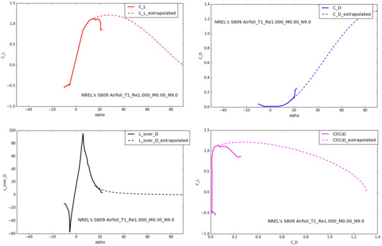 Flow angles near the hub are higher as compared to any other radial section. Usually, AoA is kept constant, so the blades are twisted to compensate. The higher the flow angle, the higher the twist, and, sometimes, twist is more inwards than outwards. However, manufacturing constraints limit blade twist, which makes the hub region operate in stall for wind turbines. Hence, airfoil polar tables must be extended to a larger range of AoA beyond stall angle. Viscous effects dominate the stall regime, and it is difficult to determine airfoil characteristics beyond stall numerically or experimentally. Extrapolation of polar using flat plate theory at higher AoA is a valid solution for such situations. It is based on the similarity between the airfoil and the flat plate at such AoAs. Few researchers have used the Viterna model [17,18], which is an empirical method for calculating polar at higher AoA and is used in the developed BEMT tool. An airfoil polar at higher AoA is essential to obtain a successful convergence with the BEMT approach. Figure 7 shows polar extrapolation for S809 airfoil at Re = 1.0 × 106. For wind turbines above 14 m/s, aspect ratio is taken as 50, which represents an infinite wing [17]. This was performed to match with the experimental values of the NREL Phase VI wind turbine as part of the validation process.