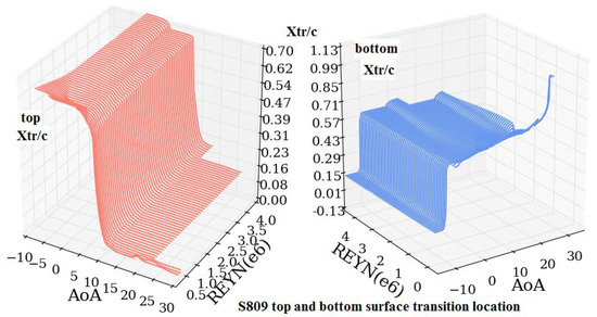 Three-dimensional plot of S809 airfoil top and bottom surface transition location varying with AoA and Reynolds number.
