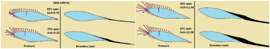 Pressure forces and boundary layer of S809 airfoil calculated using XFOIL with varying AoA spanwise.