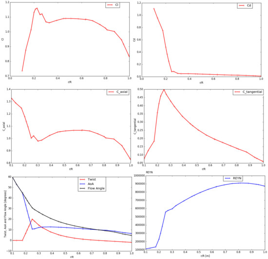 Spanwise aerodynamic properties of the reverse-engineered NREL Phase VI wind turbine derived designed using py_BEM showing twist, AoA, lift and drag, axial and tangential force coefficients and Reynolds number variation using py_BEM.