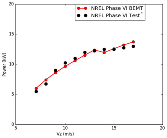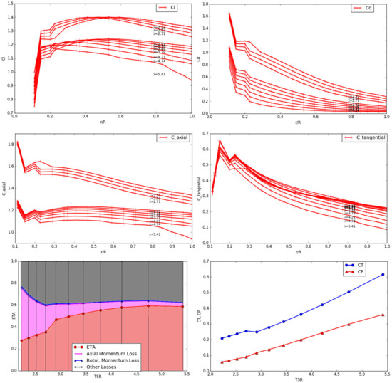 Off-design analysis is performed and validated with experimental results [42,43,44,45,46,47] by varying the flow speed to create a performance curve with S809 airfoil polar from XFOIL runs. The RPM, chord and twist were kept constant. Figure 12 shows the spanwise aerodynamic properties for the off-design analysis for varying tip speed ratios (TSR) from 2.37 to 5.41. The ETA vs. TSR subplot in Figure 12 shows that tangential (rotational) momentum loss is tiny compared to axial momentum loss, and the largest loss is due to other factors, which are due to irreversibility causing entropy to increase. The py_BEM off-design power generated was compared with the experimental results of NREL [42,43,44,45,46,47], and Figure 13 shows that it is suitably comparable and validated.