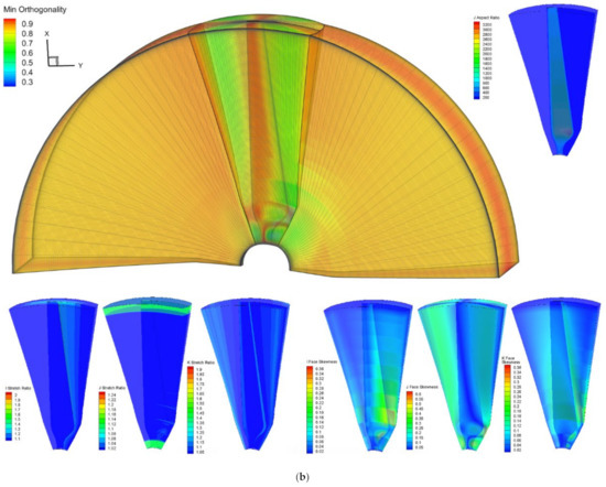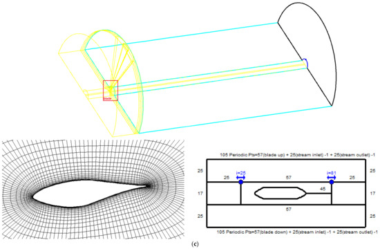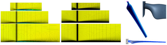 Two levels of grids were created for all the numerical simulations, 111 as coarse and 000 as fine. The 3D grids depend on the curvature and aspect ratio of the geometry modeled. Poor-quality grids hinder solution convergence and sometimes introduce solution instability. Standards for orthogonality minimum (>20), stretch ratio maximum (<2) and aspect ratio maximum (<5000) were established [54], and, although the grids created for several cases exceed these typical limits, these values occur in only a few cells away from the blade and are not severe. Figure 15 shows coarse and fine mesh densities for all three domain sizes, and the mesh density around the blade was kept constant to obtain comparable results in coarse and fine categories, respectively.
