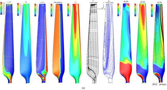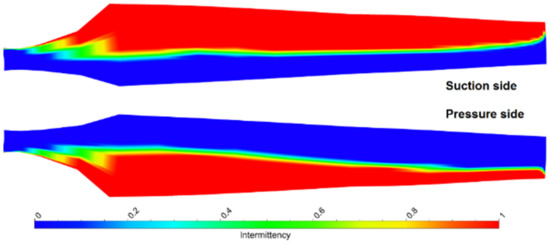 Intermittency shown on pressure and suction side of the rotor representing onset of turbulent flow.
