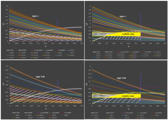 Realistic zones for Cl(r), λ(r) and CT and CP of solo wind turbines as a function of a from BET and BMT. Crossed areas are individual realistic zones and the yellow-colored area is the realistic CP zone.