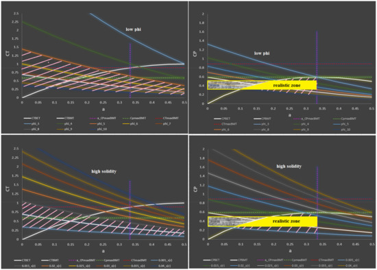 Realistic zones for φ(r), σ(r) and CT and CP of solo wind turbines as a function of a from BET and BMT. Crossed areas are individual realistic zones and the yellow-colored area is the realistic CP zone.