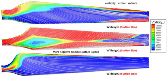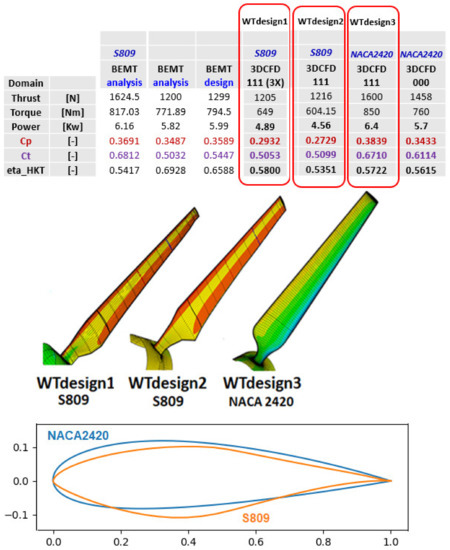 - WTdesign3: spanwise variation of AoA with NACA2420 airfoil and chord from NREL report [42,43,44,45,46,47] with cylindrical hub.