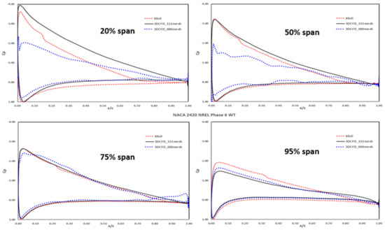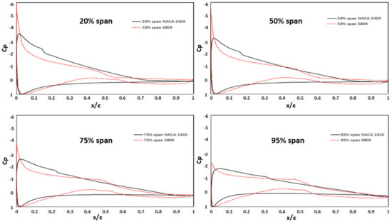 Airfoil loading at several spanwise locations from XFOIL for S809 and NACA2420 airfoils.