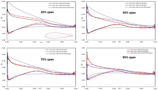 Airfoil loading at several spanwise locations for wind turbine rotor designs. Design-3 (blue dotted line) with NACA2420 has the optimal distribution.