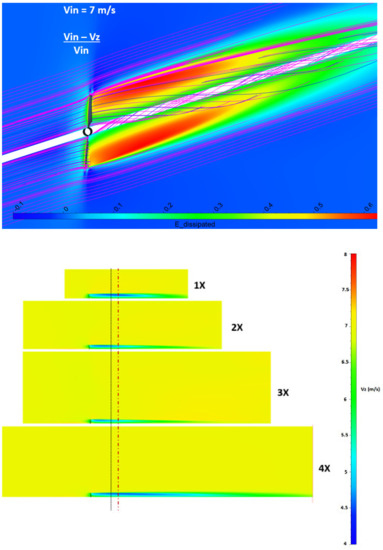Actuator disk theory tells us that is the sum of and , which become the irreversibilities in the control volume [55]. The ratio of irreversibilities to the actual work done is a good measure of how efficient the system is in converting the incoming exergy to useful work. Minimizing this ratio leads to improvements in system performance.
