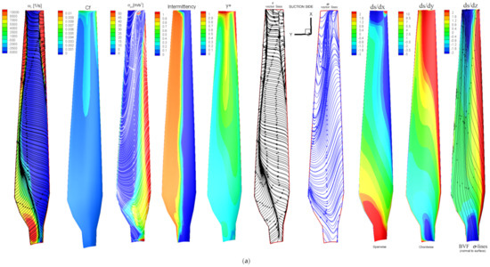 Figure 15 shows WTdesign3 with NACA 2420 airfoil spanwise and circular airfoil near the root. It also shows the mesh density for a smooth distribution near the root. Root curvature and shape influences the turbine performance, as it sets up the radial flow due to rotation and hub vortices, which become part of the wake downstream. The circular hub is stacked at its centroid, and the blade at 30% chord. Figure 16a–c shows the grid metrics for a representative wind turbine geometry (reverse-engineered representative NREL Phase VI), the grid dependency study showing thrust values for a range of mesh count and the periodic 16 blocks around the blade. The 3D steady Reynolds-Averaged Navier–Stokes (RANS) solution is computed with the Spalart–Allmaras turbulence and Abu-Ghannam/Shaw transition model activated to capture the flow transition. Figure 17 shows a typical cylindrical domain for a wind turbine 3D simulation with monitoring convergence using torque and thrust values. Domain dependency study is performed with extending domains upstream, far field and downstream and are termed as 1X (5R-5R-25R), 2X (10R-10R-30R), 3X (15R-15R-40R) and 4X (20R-15R-60R). Domain size affects the drag more than the lift and must be investigated in order to use the smallest domain appropriate for high-fidelity analysis. Wind turbines have circular cross sections near the hub for assembly, structural and pitching reasons. The py_BEM tool uses S809 airfoil lift and drag polar for the entire span and does not use circular airfoil sections near the root. Solutions with coarse and fine mesh for 1X, 2X and 3X domains are also calculated. Figure 18 shows the intermittency on the pressure and suction side for the second rotor design, indicating the transition zone chordwise as the value deviates from 0 (laminar) towards 1 (turbulent). The transition location is near 50% chord up to 95% span, and, in the top 5%, it moves towards the trailing edge.