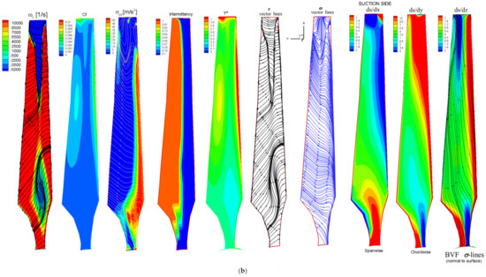- Chen, H.; Turner, M.G.; Siddappaji, K.; Mahmood, S.M.Z. Vorticity dynamics based flow diagnosis for a 1.5-stage high pressure compressor with an optimized transonic rotor. In Proceedings of the ASME Turbo Expo 2016, Seoul, Korea, 13–17 June 2016. [Google Scholar]