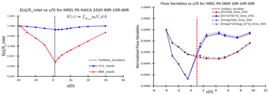 High-fidelity analysis of wind turbines is performed to understand the flow behavior downstream of the blades in detail using steady and unsteady CFD or LES. Possible factors that reduce the thermodynamic efficiency are processes leading to exergy (available work) destruction and entropy generation. Increasing the efficiency can also be attained by energy quantification applying the second law of thermodynamics, which relates to entropy, exergy and other concept generation [30]. Stickle et al. [31] defined axial and rotational momentum loss based on experiments conducted, and Denton provided a detailed account of entropy-based loss [32]. Masters et al. [26] compared BEMT–CFD with the blade-resolved geometry (BRG) CFD method in terms of velocity deficit. Lawson et al. [33] showed that computational time-step has a minimal effect on the solution and that the mesh needs to have a higher density for results comparable to experimental data. Aranake et al. [34] demonstrated that a transition model improves 3D solution quality during small separation regions at low velocity and improved 2D validation of S827 airfoil with the experimental data. Rui et al. [35] investigated the entropy change in the turbulent boundary layer and related it to the viscous dissipation using direct numerical simulation (DNS) for free-shear-layer-based flows. Martini et al. [36] reviewed different methodologies to predict power loss in wind turbines due to adverse meteorological conditions, with a modeling approach including both BEMT and CFD for the last 15 years. Siddiqui et al. [37] demonstrated the effect of reduced geometric or numerical approximation on high-fidelity aerodynamic performance of wind turbines compared with experimental data. Capturing transitional flow for a turbulent application such as wind turbines is crucial, and Michna et al. [38] demonstrated the accuracy of several transition models for a thick airfoil.