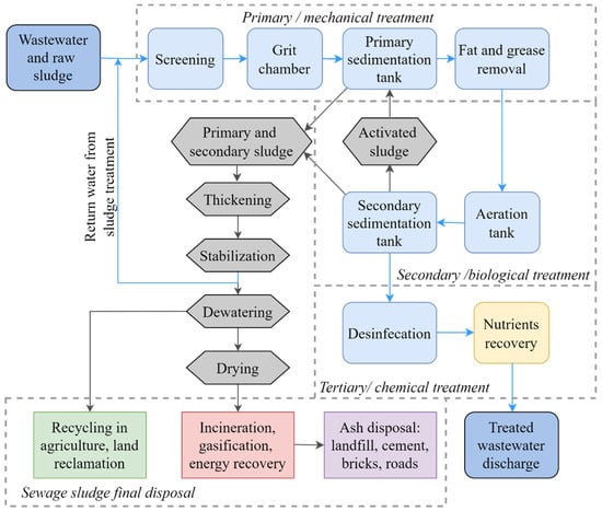 Although sewage sludge represents only 1–2% of the treated wastewater volume, its disposal is complex and expensive. Sewage sludge treatment and disposal represent between 20% and 60% of the total operating costs in wastewater treatment plants [,]. In order to resolve the problem of sewage sludge and to minimize its negative impact on the environment, EU countries started to implement different treatment methods—from wastewater treatment (primary, secondary and tertiary wastewater treatment processes) to sewage sludge treatment processes, as shown in Figure 1. The research community is focused on developing new and advanced technologies for the treatment of sewage sludge, which would be capable of performing energy and nutrient recovery at the same time [,].