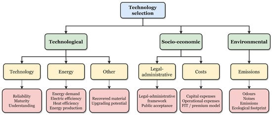 The ranking is presented in qualitative (score 1–5, where 1 is the lowest and 5 is the highest grade) and quantitative terms (specific unit). The qualitative segment is prone to subjectivity, while it is determined and based on the author’s experience in the observed field and state-of-art in the observed country, in this case, Croatia. In order to retain as much objectivity as possible, and with the lack of existence of observed technologies in Croatia, interviews with national experts who are familiar with observed technologies and are experts in the fields of climate and environment protection (5 experts) and waste management (6 experts) were conducted. This enabled determination of specified criteria. In the following sections, these are referred to as “Communication with experts”, while the entire questionnaires and responses are provided in the Supplementary Materials.