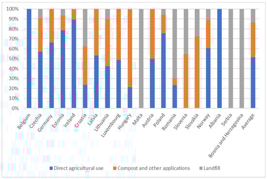 Consequently, in recent years, the share of incineration has been increasing while the shares of agricultural use, landfilling, and land reclamation are decreasing []. Incineration of sewage sludge is the preferred disposal practice in Austria, Belgium, Germany, and the Netherlands. In addition to mono- and co-incineration, innovative systems for the thermal treatment of sewage sludge are being developed [,,], methods such as pyrolysis or gasification [,]. The percentage distribution of sewage sludge disposal practices in European countries is shown in Figure 3 (based on available data from Eurostat).