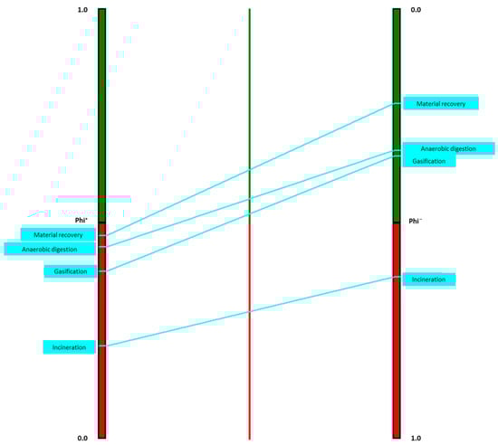 The above criteria were used as input data for the PROMETHEE multicriteria decision-making method. Figure 4 shows the results obtained using the PROMETHEE I partial ranking. Material recovery technology returns the best result in terms of both positive (Phi+) and negative rankings, which measure the respective advantages and disadvantages of the observed technology over the other options. Anaerobic digestion technology is ranked in second place, with comparable rankings to that of gasification technology, which is ranked third. Incineration technology is ranked fourth and exhibits the least advantages but most disadvantages over the other sewage sludge disposal methods.