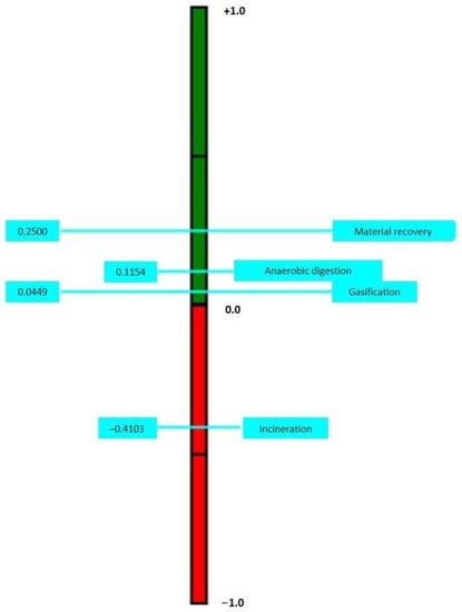 The disadvantages of incineration technology are also observed in the PROMETHEE II complete ranking, where all the other technologies turn out better ranked than incineration, as shown in Figure 5. The complete ranking system reaffirms material recovery as the best sewage sludge treatment technology as it returns most of the sewage sludge material value with the least negative impact on human health and the environment.