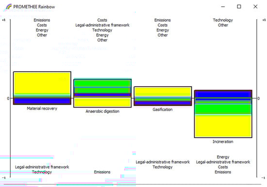 The impact of each criteria cluster on the final rankings is depicted using the PROMETHEE rainbow graphical representation in Figure 6. Each criteria cluster and criteria group is attributed a color: