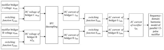 In Figure 1a, the inductances on both sides of the balanced reactor are L1 and L2, and the mutual inductance is M12. After decoupling the balanced reactor, the equivalent circuit of the parallel 12-pulse rectifier in Figure 1b is obtained. Compared with the derivation process of the series 12-pulse rectifier [19], Figure 2 shows the decoupling process of IPT and the calculation of the DC current of each rectifier bridge, which is required to analyze the parallel 12-pulse rectifier.