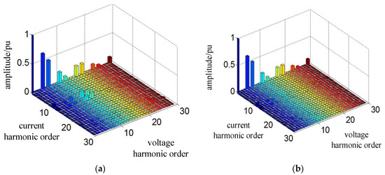 AC current harmonic spectrum of 12-pulse rectifier under different conditions. (a) Case 1; (b) Case 2.