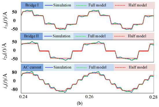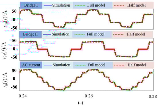 Figure 5 shows the waveforms of the AC current of the 12-pulse rectifier, ia(t), ia1(t), and ia2(t), respectively, with different parameters. The current calculated by the model proposed in this paper, which considers the influence of the negative sequence voltage (complete model), is matched with the simulation results in cases 1 and 2. However, the waveform that does not consider the influence of the negative sequence voltage (half model) is obviously different from the complete model and simulation result in case 2 (which has a bigger negative sequence). The peak value of the simulation, complete model, and half model of ia(t) of case 2 are 83.5A, 83A, and 70A, respectively.