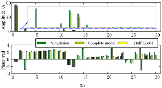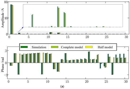 The amplitude and phase of the harmonic current of the 12-pulse rectifier are shown in Figure 6. The current main contains 12 k ± 1th harmonic current. With the influence of negative sequence, 3rd, 9th, 15th …, the harmonic current is observed in the simulation and complete model image.