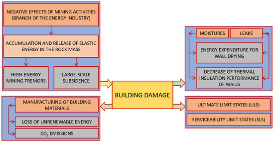 The last issue, which is not without significance for the global trend of reducing energy expenditure and releasing CO2 into the atmosphere, is the production of building materials [15,16]. Unfortunately, ineffective predictions of the range and intensity of damage at the stage of determining the extent of retrofit or repair work required, especially in existing buildings, contribute to the waste of building materials already at the stage of their production [17]. Given the large number of buildings at risk of damage, the overestimation is so large that they can cause a significant loss of irreversible energy and contribute to a further increase in CO2 emissions (Figure 1).
