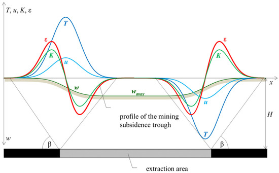 Distribution of surface deformation indicators over the extraction area: (ε) horizontal ground strain; (u) vertical displacement; (T) slope; (K) ground curvature; (H) depth of cover; (β) the angle of impact [29].